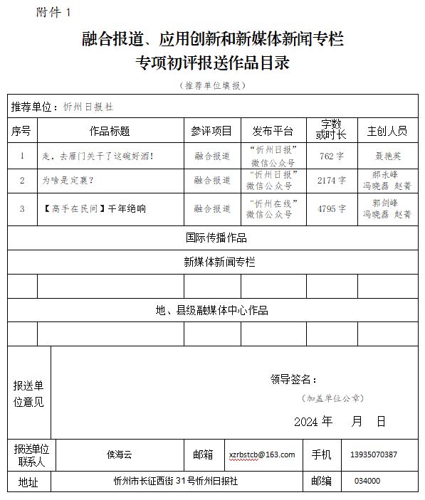 經忻州日報社編委會研究決定,以下作品擬推薦申評第33屆山西新聞獎,現予以公示。有反對意見者,請將反對意見書面報至統(tǒng)計考核部。