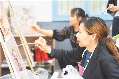 近年來(lái),湖南省瀏陽(yáng)市小河鄉(xiāng)引進(jìn)農(nóng)民畫室產(chǎn)業(yè),讓農(nóng)民可以在家務(wù)農(nóng)時(shí)利用空余時(shí)間務(wù)工。小河鄉(xiāng)現(xiàn)有460余名農(nóng)民畫師,累計(jì)帶動(dòng)50余名貧困戶參與。圖為小河鄉(xiāng)烏石村村民在繪制油畫。