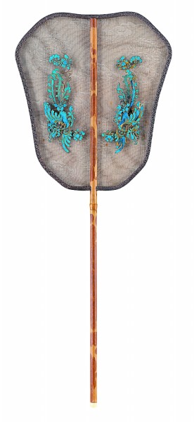 湘妃竹柄,夾祥云團(tuán)鶴紋羅及草編面,鑲玉、點(diǎn)翠鳳凰八邊形扇 蔡念群