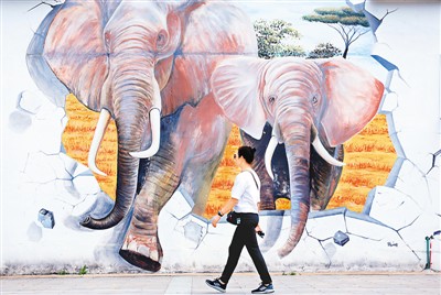 游客行走在安徽省合肥市廬江縣湯池鎮(zhèn)果樹村文化廣場(chǎng)藝術(shù)畫前。王閩 攝(人民圖片)