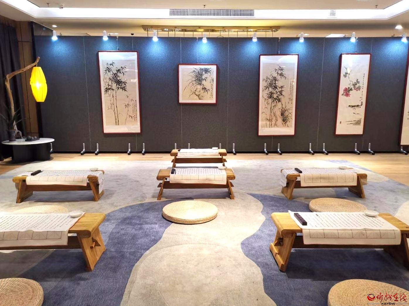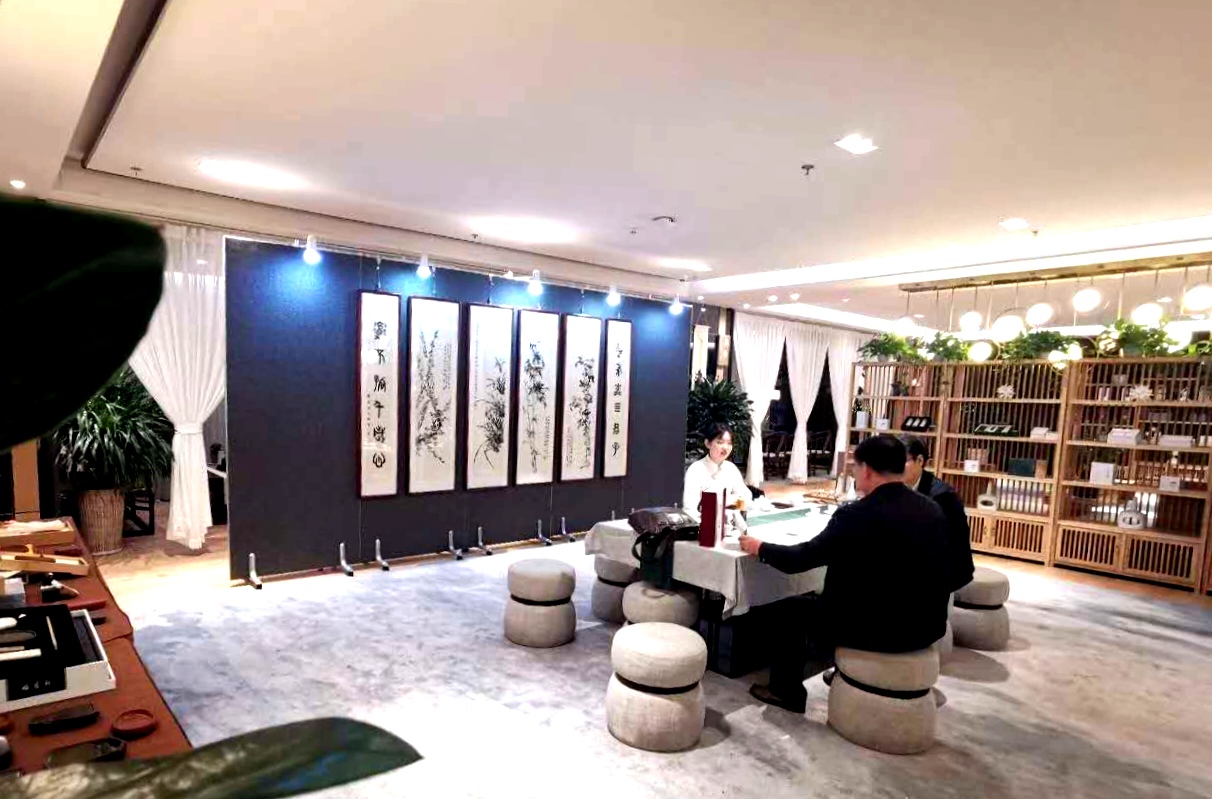 繞過木架綠植,穿行于鋪陳有字貼宣紙的書案,現(xiàn)場彈奏的琵琶古韻從耳畔飄過,茶香伴著墨香沁人心脾。你可以駐足細(xì)品這些書畫的精微高超之處,你可以圍桌而坐品茗閑談,興起時(shí)你還可以搖管潑墨揮灑一番……