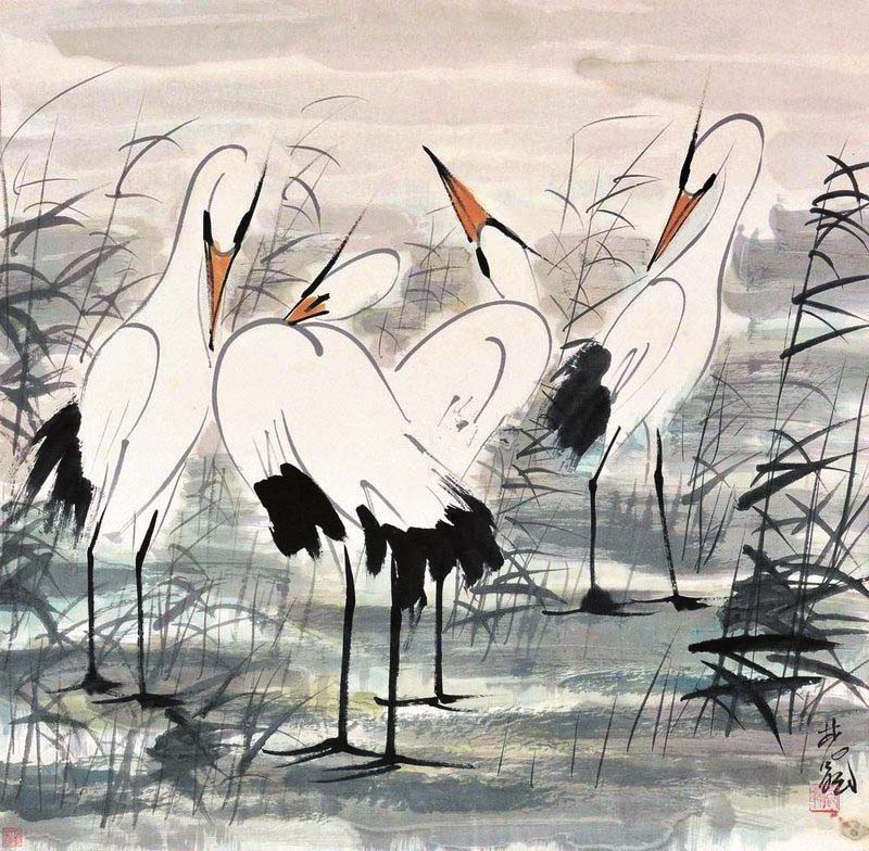 到了近現(xiàn)代,傳統(tǒng)文藝思想開始發(fā)生轉(zhuǎn)變,呂澂、康有為等人在繪畫領(lǐng)域提出改良思想,鶴主題的繪畫也有所變化。在林風(fēng)眠創(chuàng)作的《群鶴圖》《雙鶴圖》《白鶴》等作品中,既可以看到中國(guó)畫白描的影子,又可以感受到西方速寫技法的影響?!度胡Q圖》由幾只立于廣袤水草的白鶴構(gòu)成,它們姿態(tài)各不相同。與鶴之閑適姿態(tài)相對(duì)應(yīng)的是隨風(fēng)浮動(dòng)的蘆葦,它們?cè)谖L(fēng)吹拂下雖形態(tài)萬千,但并不雜亂,在總體偏暗的色調(diào)中顯出和諧之味?!峨p鶴圖》表現(xiàn)了鶴的輕盈姿態(tài),兩只鶴步伐保持一致,展示出閑適自得之感。林風(fēng)眠筆下的鶴,顯然沒有古代繪畫中仙風(fēng)道骨、富貴長(zhǎng)壽之意,與寫意之鶴相比,其作品里的鶴與自然萬物融為一體,表達(dá)出強(qiáng)有力的現(xiàn)代語言。