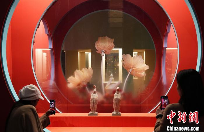 據(jù)介紹,這是蛇類紋飾作為裝飾題材出現(xiàn)在商周青銅禮器之上的一種典型代表。半人半蛇的唐代“伏羲女媧像立幅”帛畫,印證著伏羲女媧這一久遠(yuǎn)的文化信仰,通過絹帛畫形式在當(dāng)時(shí)的吐魯番地區(qū)傳播,并吸引其他民族的崇奉。此外,展廳中充滿新春氛圍感的桃花洞釉燈籠瓶、白玉“天官賜?!迸濉ⅰ昂镁啤卑子员P等近200余件(套)館藏文物精品,書寫著對(duì)即將到來的蛇年新春的期待和祝福。