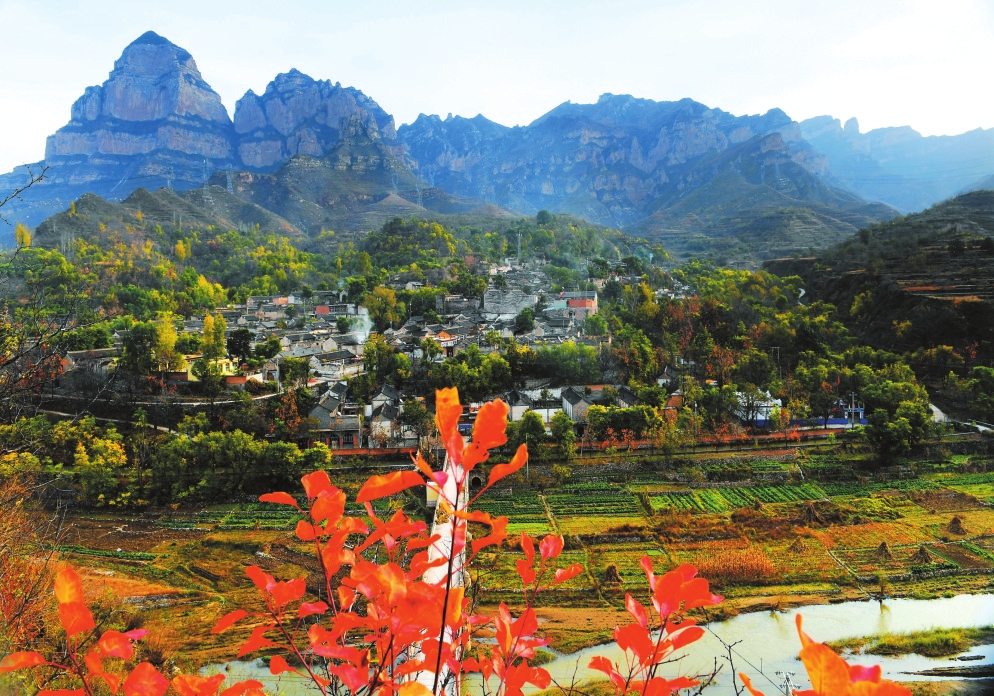 秋天的南莊是一個多彩的海洋。黃櫨和椿樹的紅葉像晚霞一樣映紅了山崖與河谷;燈籠一樣的金黃色柿子色澤誘人,掛在高高的柿樹上;依舊翠綠的花椒樹枝頭,一簇簇鮮紅的花椒若隱若現(xiàn);婆娑的黑棗樹上星星點點,長滿褐色的果實,沉甸甸的,壓彎了樹梢。
