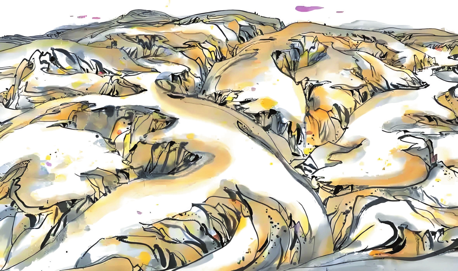 1989年10月的河曲寫生,是吳冠中藝術生涯的重要轉(zhuǎn)折點。在陪同的學生王秦生引導下,這位古稀老人尋找“黃土荒漠之典型地區(qū)”,最終駐足晉西北河曲縣。每日晨起,他面對被雨水沖刷、滿山皆溝壑的地貌,靜心思考,猛然產(chǎn)生了驚人的藝術聯(lián)想——起伏的山形如同眾多老虎,而那些溝壑恰似老虎皮毛上的斑紋。他在《出現(xiàn)老虎》一文中寫道:“我終于發(fā)現(xiàn)黃土高原是展拓了的老虎之群,其間伏臥著無數(shù)猛虎,有的正將躍起,有的還在酣睡。作完數(shù)幅黃土高原,意猶未盡,于是我畫起老虎來?!边@種將地理特征轉(zhuǎn)化為藝術創(chuàng)作標志著吳冠中完成“從風景寫生到精神寫意”的蛻變,其價值在于為現(xiàn)代中國畫開辟了根植本土、融貫中西的新路徑。一個月河曲翠峰山寫生之旅誕生的《老虎高原》,更以極富樂感的線條勾勒出這片土地精神的圖騰。