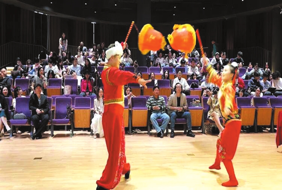 活動現場,藝術團團長劉延鳳作為主講人,將黃河岸邊的千年回響娓娓道來。她從“戶有弦歌新治譜”的記載,講到被列入國家級非遺的榮光;從高亢遼闊、自由奔放的“山曲”風味,解析融合三省民間音樂元素的“二人臺”小戲的獨特魅力。多位優(yōu)秀演員聯袂登臺,他們用精湛的技藝將這份厚重的文化遺產鮮活呈現。市級非遺代表性傳承人鄔光演唱的《放羊漢唱起爬山調》,一聲出口,仿佛將黃土高原的溝壑縱橫與黃河的奔騰不息盡數帶到現場;優(yōu)秀青年演員王佳、楊慧、鄔強等演繹的《河曲人愛把山曲唱》《打藍靛》《壓糕面》等多首河曲民歌二人臺的經典曲目與劇目,展現了民間生活的喜怒哀樂,濃郁的鄉(xiāng)土氣息與真摯情感深深打動了在場師生。