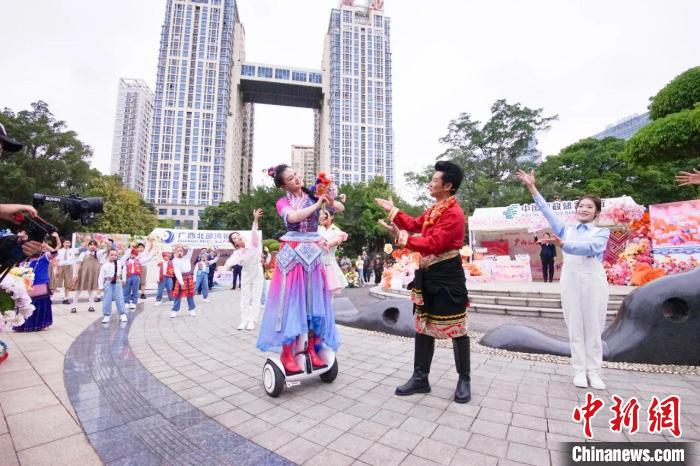 此外,在“廣西三月三·八桂嘉年華”開幕式暨“四季村歌”活動啟動儀式上,廣西戲劇院“新劉三姐”扮演者陳慧身著絢麗民族盛裝,攜手多地游客共唱山歌,融合平衡車表演和戲曲唱腔的演繹方式,展現(xiàn)廣西山歌與時俱進演變過程,為廣西“三月三”這場民族盛會添新潮。