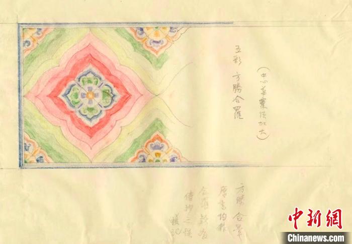 5月27日,“彩畫(huà)千年——中國(guó)官式彩畫(huà)傳承與創(chuàng)新展”在故宮博物院永壽宮展廳正式對(duì)公眾開(kāi)放。圖為梁思成手繪的宋代五彩方勝合羅(復(fù)制品)。(故宮博物院供圖)