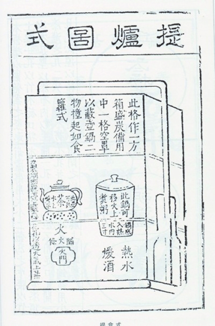 明代戲曲家高濂編撰的《遵生八箋》,可謂士大夫精致生活的指導(dǎo)書,書中仔細介紹了提爐的形制與結(jié)構(gòu),還附上了插圖。書云:“式如提盒,亦余制也。高一尺八寸,闊一尺,長一尺二寸,作三撞。下層一格,如方匣,內(nèi)用銅造水火爐,身如匣方,坐嵌匣內(nèi)。中分二孔,左孔炷火,置茶壺以供茶;右孔注湯,置一桶子小鑊有蓋,頓湯中煮酒。長日午余,此鑊可煮粥供客。傍鑿一小孔,出灰進風(fēng)。其壺鑊迥出爐格上,太露不雅,外作如下格方匣一格,但不用底以罩之,便壺鑊不外見也。一虛一實共二格,上加一格,置底蓋以裝炭,總?cè)癯梢患埽峡晒涥P(guān),與提盒作一副也。”