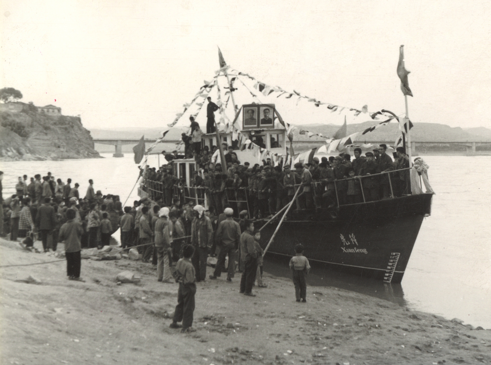 保德縣的木船造得快,取名“先鋒號”,于1977年5月23日,農(nóng)歷四月初六正式下水。這是晉陜峽谷有史以來第一艘機動船,千年未有之新鮮事,少不了要隆重慶賀。有老照片記錄當年盛況:黃河水流浩大,“先鋒號”泊于岸邊,駕駛艙頂上并排矗立著偉人的大幅畫像,上用紅綢花裝飾,船頭船尾紅旗招展,四條彩帶從駕駛艙頂端連向船沿。縣領(lǐng)導(dǎo)排坐于船上,禮儀小姐扯著紅綢,河岸上站滿了看熱鬧的群眾。河風(fēng)吹動大小旗幟,機船顯得威風(fēng)凜凜。