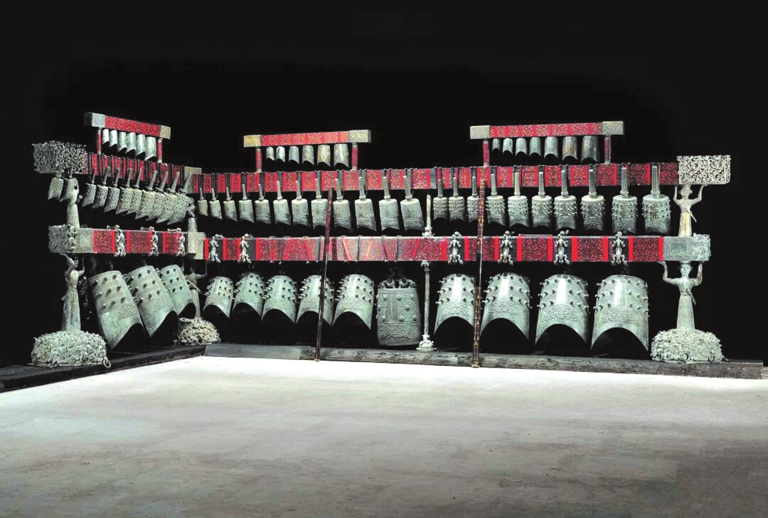 最具代表性的樂(lè)鐘無(wú)疑是“青銅之冠”的曾侯乙編鐘,它展現(xiàn)了先秦禮樂(lè)文明與青銅鑄造技術(shù)的最高成就。曾侯乙編鐘是戰(zhàn)國(guó)早期曾國(guó)國(guó)君的“禮樂(lè)重器”,1978年出土于今湖北隨州的曾侯乙墓,是迄今發(fā)現(xiàn)數(shù)量最多、保存最好、音律最全、氣勢(shì)最宏偉的一套編鐘,共65件,分3層8組懸掛于彩漆鐘架之上,鐘體總重達(dá)2.5噸。整套編鐘低音渾厚、中音圓潤(rùn)、高音清脆,音域?qū)拸V,而且中心音域內(nèi)半音齊備,可以旋宮轉(zhuǎn)調(diào),演奏各種音樂(lè)。1978年8月1日,沉寂了2400多年的曾侯乙編鐘演奏了《東方紅》《國(guó)際歌》和古曲《楚殤》、民族歌曲《草原上升起不落的太陽(yáng)》等各種樂(lè)曲,樂(lè)音悠揚(yáng)回蕩。