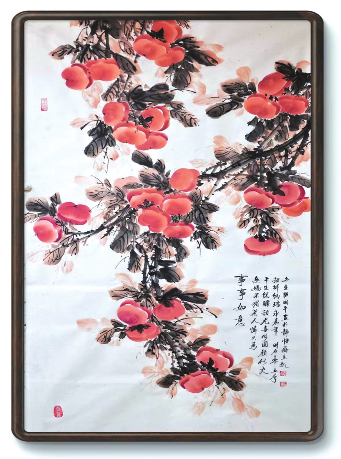 在樊國平眾多題材探索中,《事事如意》系列柿子圖可謂其藝術(shù)精神與人生哲思的縮影。這些作品超越了尋?;B畫的怡情悅性,成為她寄托情懷、叩問生命的重要載體。畫中那一串串、一簇簇丹柿,色澤溫潤,形態(tài)豐盈,承載著諧音“事事如意”的吉祥寓意,滿足了社會對美滿生活的樸素祈愿。她以此通俗意象為入口,引領(lǐng)觀者步入一個融匯儒、道、佛哲學理念的深邃境界,實踐著中國藝術(shù)“技進乎道”“以畫載道”的至高追求。