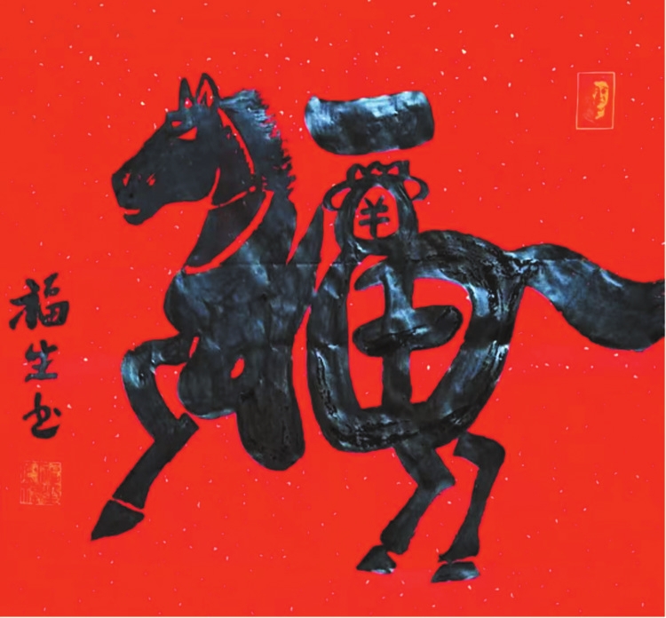 生肖文化,是中華民俗之根脈,王福生緊扣福字主題,應時而作,應物而書,將十二生肖意象與福字完美融合,創(chuàng)作出獨具氣象的“生肖福”系列,合于《道德經(jīng)》“動善時”的智慧——順天時,合地利,應人心,與時俱化。其馬年“馬上?!笨胺Q福字神品:以草書筆勢,將“?!迸c“馬”渾然合一,“礻”為駿馬昂首,鬃毛飛揚;“畐”為身軀矯健,奮蹄向前;“田”化為鞍飾,點睛傳神。整幅福作一氣呵成,筆走龍蛇,靈動奔放,卻又穩(wěn)而不飄,勁而不躁,正是老子“知其雄,守其雌”的筆墨體現(xiàn)。