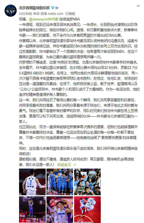 人民網(wǎng)北京9月15日電(楊喬棟)15日,林書豪通過個人社交平臺發(fā)布自制視頻宣布,下個賽季將不再代表北京首鋼男籃征戰(zhàn)CBA賽場,而將繼續(xù)尋求征戰(zhàn)美國職業(yè)籃球聯(lián)賽的機會。林書豪在視頻中稱,最近四周都在思考下一步的規(guī)劃,但是最終還是忍痛做了一個艱難的決定——暫時告別CBA,“我決定今年(下個賽季)不回首鋼去打球,這個決定是我人生最難的一個決定。”隨后,北京首鋼男籃通過官方微博發(fā)布長文,在確認(rèn)林書豪“離開”的同時也第一時間為其送上祝福。北京男籃官宣全文如下: