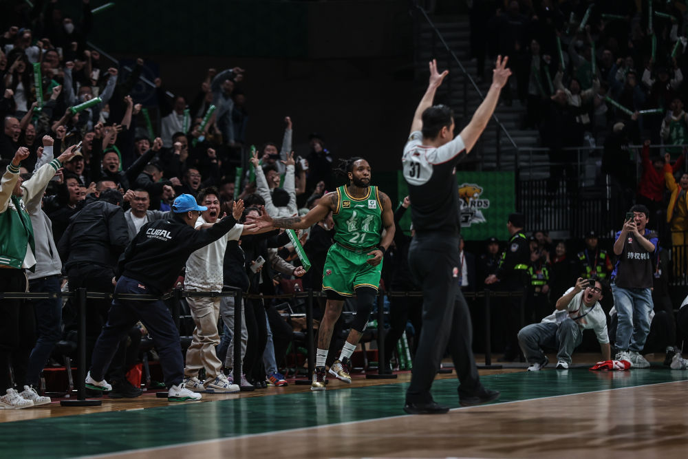 4月13日,遼寧隊球員威爾斯投進(jìn)絕平三分后慶祝。新華社記者 潘昱龍 攝
