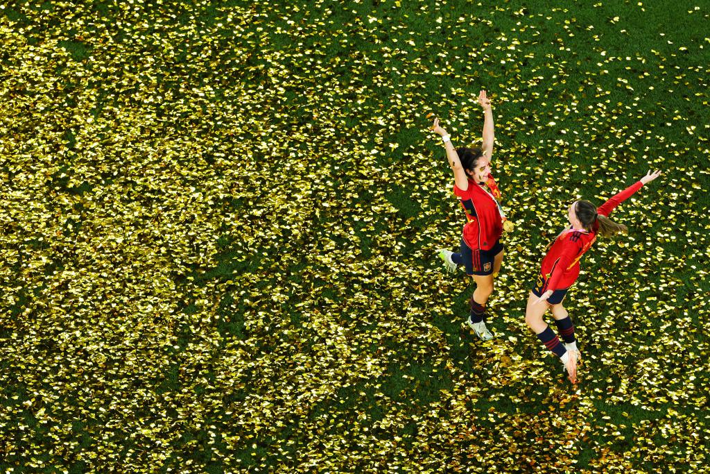 圖為西班牙隊(duì)球員在2023年國(guó)際足聯(lián)女足世界杯決賽賽后慶祝奪冠。新華社記者 白雪飛 攝