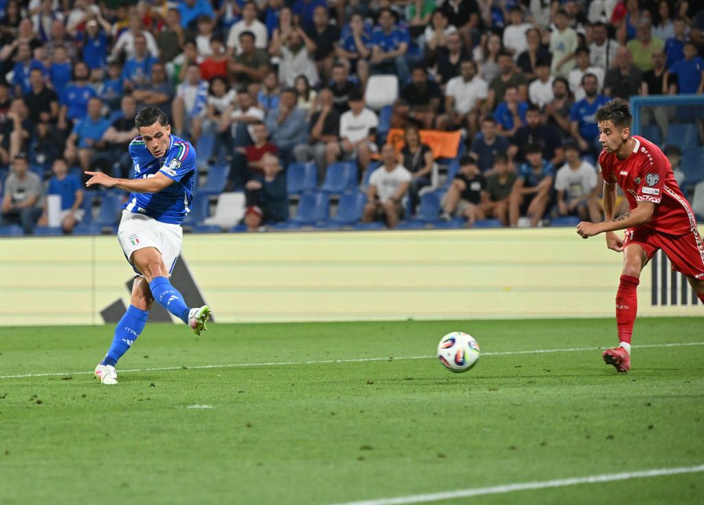 6月9日,意大利隊球員拉斯帕多里(左)在比賽中射門得分。新華社發(fā)(阿爾貝托·林格利亞攝)