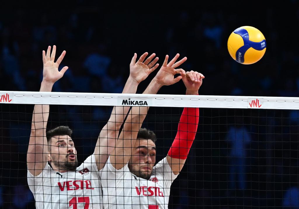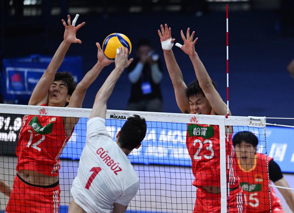 土耳其隊(duì)球員穆拉特·葉尼帕扎爾(左)、貝迪爾汗·比比爾在比賽中攔網(wǎng)。新華社記者 張博文 攝 中國隊(duì)主教練海寧說:“今天更像是一場心理戰(zhàn),我們?nèi)鄙倭粟A球的斗志和能量。土耳其隊(duì)比我們更敏銳、果斷。我們要從失利中吸取教訓(xùn),在贏得兩場比賽后,你必須付出更多才能取勝,顯然我們今天沒做到這點(diǎn)?!?/p> 海寧對隊(duì)伍在該站的整體表現(xiàn)感到滿意和欣喜。他說:“在主力球員張景胤、王徑一等因傷缺席的情況下,我們?nèi)〉昧藘蛇B勝,這對中國隊(duì)來說前進(jìn)了一大步?!?/p> 根據(jù)賽程,中國隊(duì)將分別于6月底和7月中旬參加美國芝加哥站、波蘭格但斯克站的比賽。海寧表示,無論是主場還是客場,中國隊(duì)不會懼怕強(qiáng)手。
