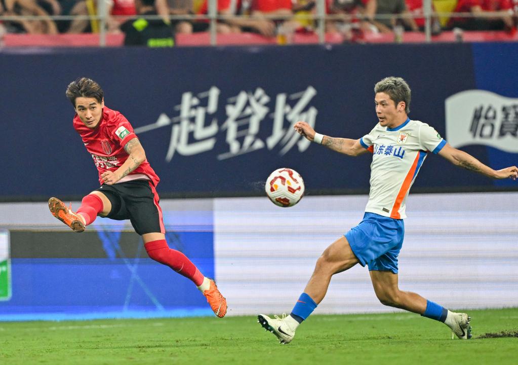 8月2日,成都蓉城隊球員韋世豪(左)在比賽中射門。新華社發(fā)(尹鋼攝)