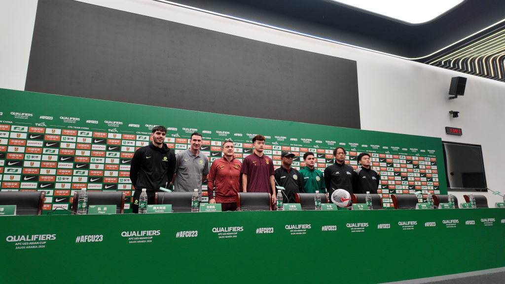 中國隊球員及教練團隊在新聞發(fā)布會上