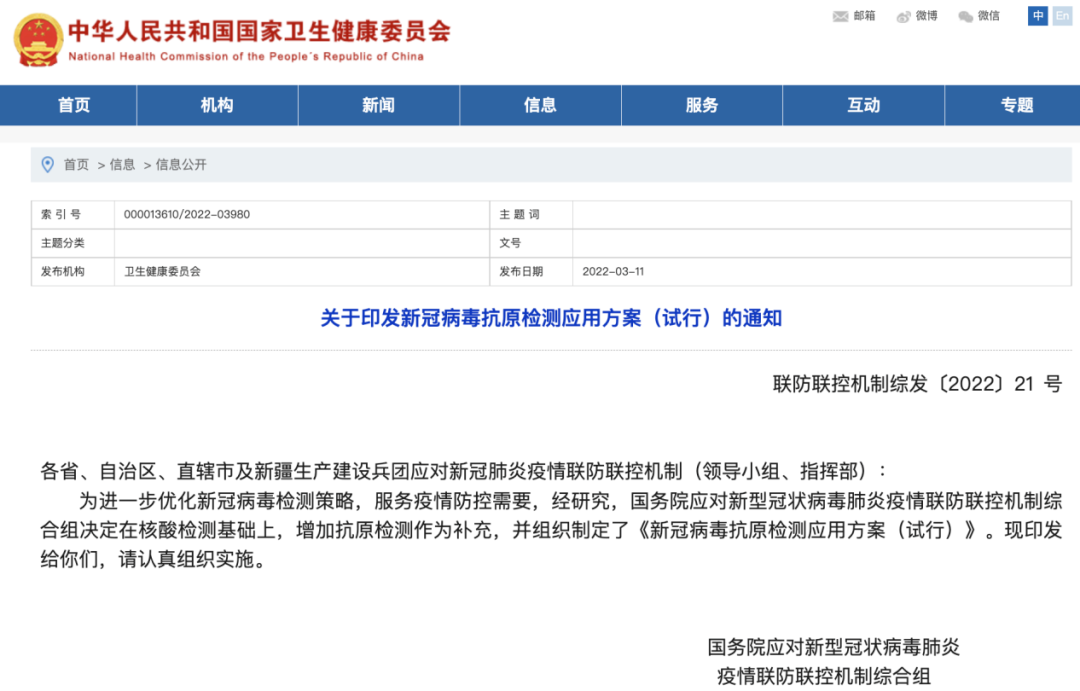通知指出,為進(jìn)一步優(yōu)化新冠病毒檢測策略,服務(wù)疫情防控需要,經(jīng)研究,國務(wù)院應(yīng)對新型冠狀病毒肺炎疫情聯(lián)防聯(lián)控機(jī)制綜合組決定在核酸檢測基礎(chǔ)上,增加抗原檢測作為補(bǔ)充。