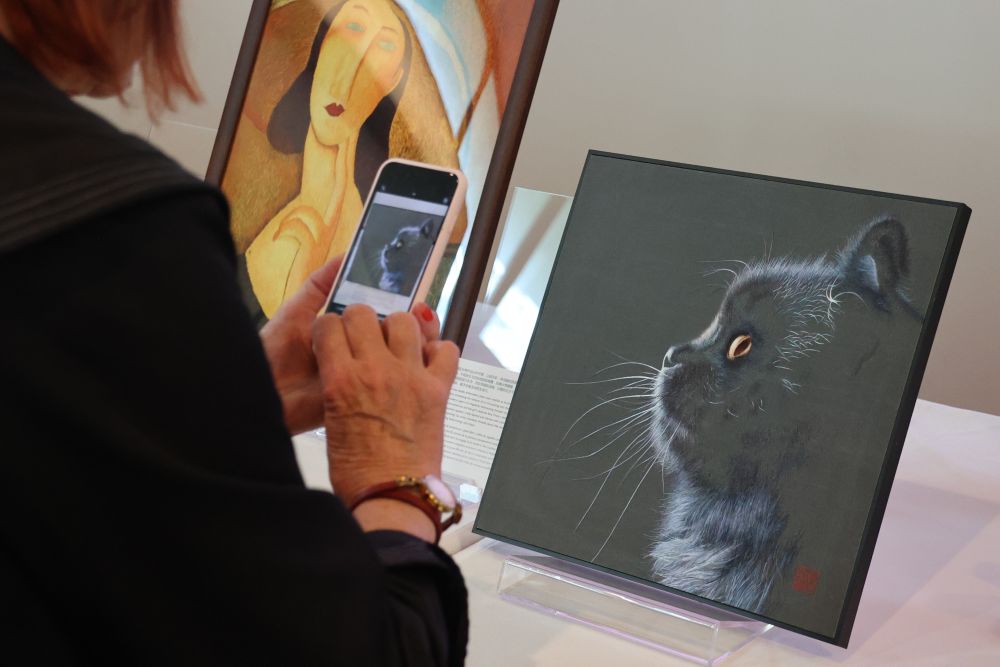 2025年9月4日,觀眾在法國(guó)巴黎中國(guó)文化中心參觀《一針不多一針不少的蘇繡》主題展時(shí)拍照留念。新華社記者 張百慧 攝