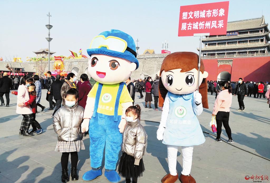 2月26日,農(nóng)歷辛丑年元宵節(jié),忻州古城北城門樓廣場上,兩名卡通形象裝扮的環(huán)保志愿者向群眾宣傳環(huán)保政策法規(guī),倡導(dǎo)環(huán)保過節(jié)、文明旅游。為豐富和活躍群眾文化生活,展現(xiàn)忻州古城保護(hù)活化新成就,元宵節(jié)期間,忻州古城舉行了社火游行,吸引了廣大市民。忻州市環(huán)保志愿者協(xié)會借機組織了環(huán)保宣傳活動。 (張劍雄 攝)