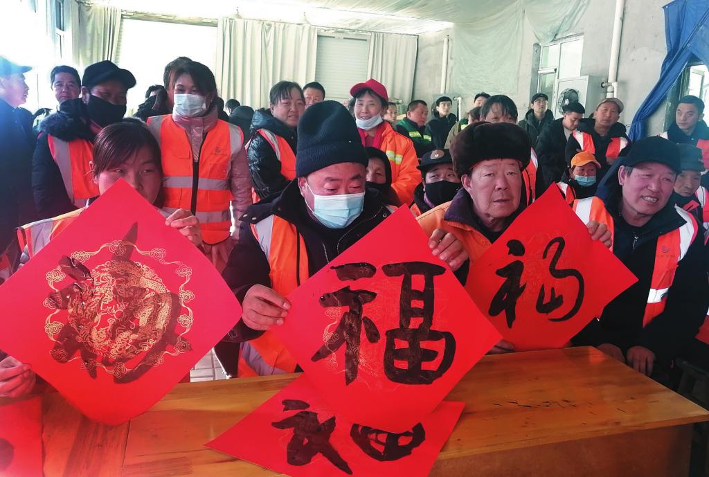 1月19日,民建忻州市委組織書法會(huì)員赴靜樂縣為50名環(huán)衛(wèi)和園林工人現(xiàn)場寫春聯(lián),并送上節(jié)日的問候。本報(bào)記者 李濤攝