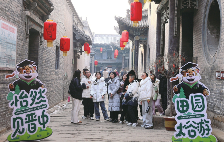 ④2月1日,太谷三多堂博物館,外地游客傾聽(tīng)導(dǎo)游講述晉商創(chuàng)業(yè)故事。