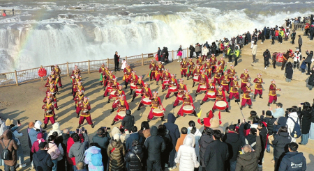①1月30日,吉縣壺口瀑布景區(qū)邀請(qǐng)鼓樂(lè)隊(duì),為游客呈現(xiàn)了一場(chǎng)特色鮮明、氣勢(shì)恢宏的視覺(jué)盛宴。