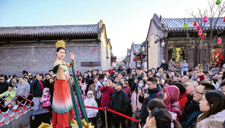 “在大同古城鬧紅火,真是年味兒十足、體驗(yàn)感拉滿?!眮?lái)自太原的游客張文文開(kāi)心地說(shuō)。春節(jié)假期,大同市文化活動(dòng)豐富多彩,以大同古城為中心,市縣(區(qū))聯(lián)動(dòng)開(kāi)展的“流光溢彩迎新年”“歡歌樂(lè)舞過(guò)大年”“梨園百花賀新年”“夢(mèng)幻冰雪逐夢(mèng)年”“翰墨書香文化年”“古都風(fēng)華盛世年”6個(gè)主題43項(xiàng)地方特色濃郁、群眾參與度高的文化活動(dòng),讓市民和游客目不暇接、流連忘返。在華嚴(yán)廣場(chǎng)、鼓樓東西街、下寺坡街、關(guān)帝廟戲臺(tái)、純陽(yáng)宮廣場(chǎng)、大廟角、古城東南邑等處,社火巡游、過(guò)大年唱大戲、文化IP演繹、市集等活動(dòng)精彩紛呈。