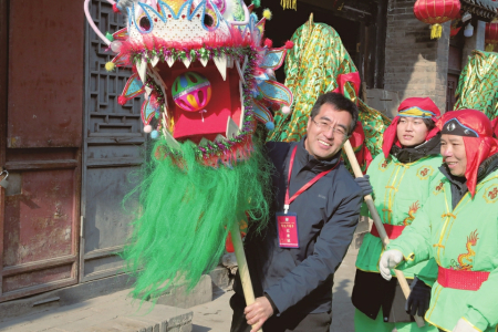 臨汾記者站記者郭玉琴(左二)在臨汾市水門(mén)街采訪“洋媳婦”扎拉過(guò)中國(guó)年。