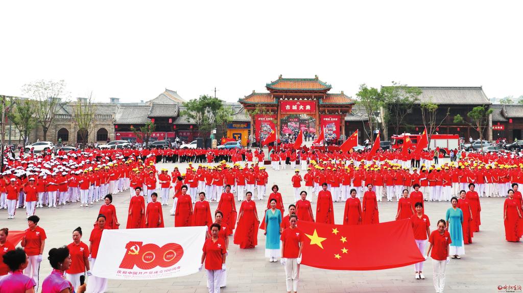 頌歌獻(xiàn)給黨,啟航新征程。在中國共產(chǎn)黨成立100周年之際,千余人歡聚忻州古城廣場,群情昂揚、載歌載舞喜慶黨的百年華誕。 張存良攝