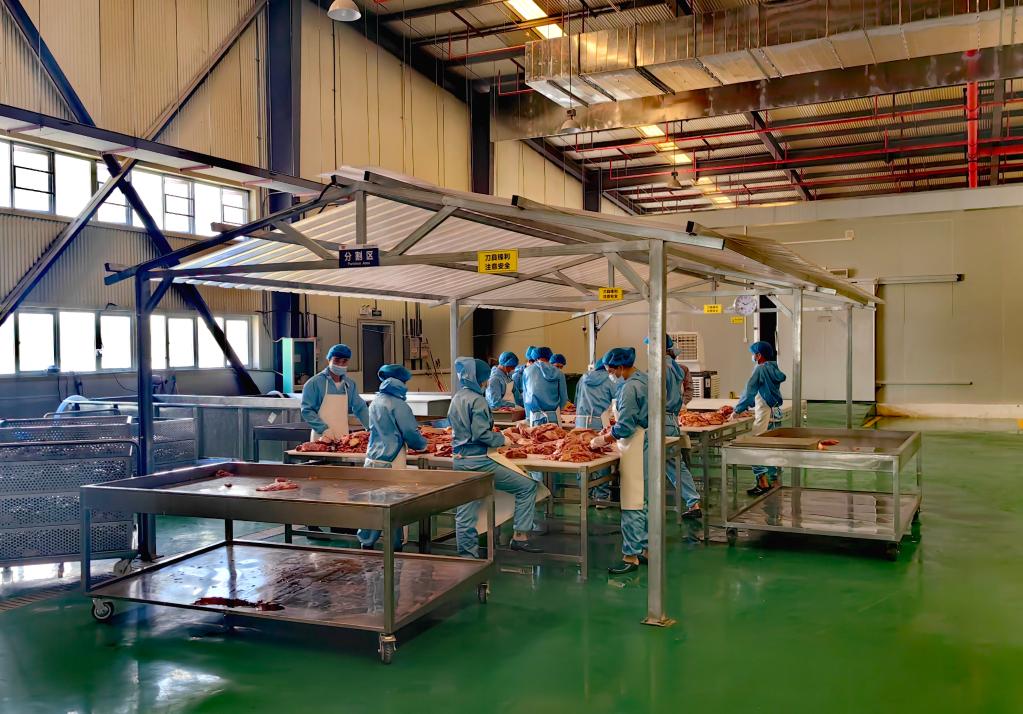在海南紅焱食品有限公司廠房內,工人們正在學習牛肉分解。新華社記者吳茂輝 攝