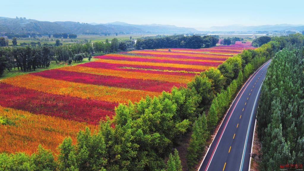 金秋時節(jié),靜樂藜麥陸續(xù)進(jìn)入成熟期。不同品種的藜麥成熟后,麥穗呈現(xiàn)出火紅、金黃、紫紅等多種色彩,藜麥田宛如一幅色彩斑斕的油畫。在陽光的照射下,隨風(fēng)搖擺的藜麥穗和村民們忙碌的身影組成了秋日的豐收美景圖。