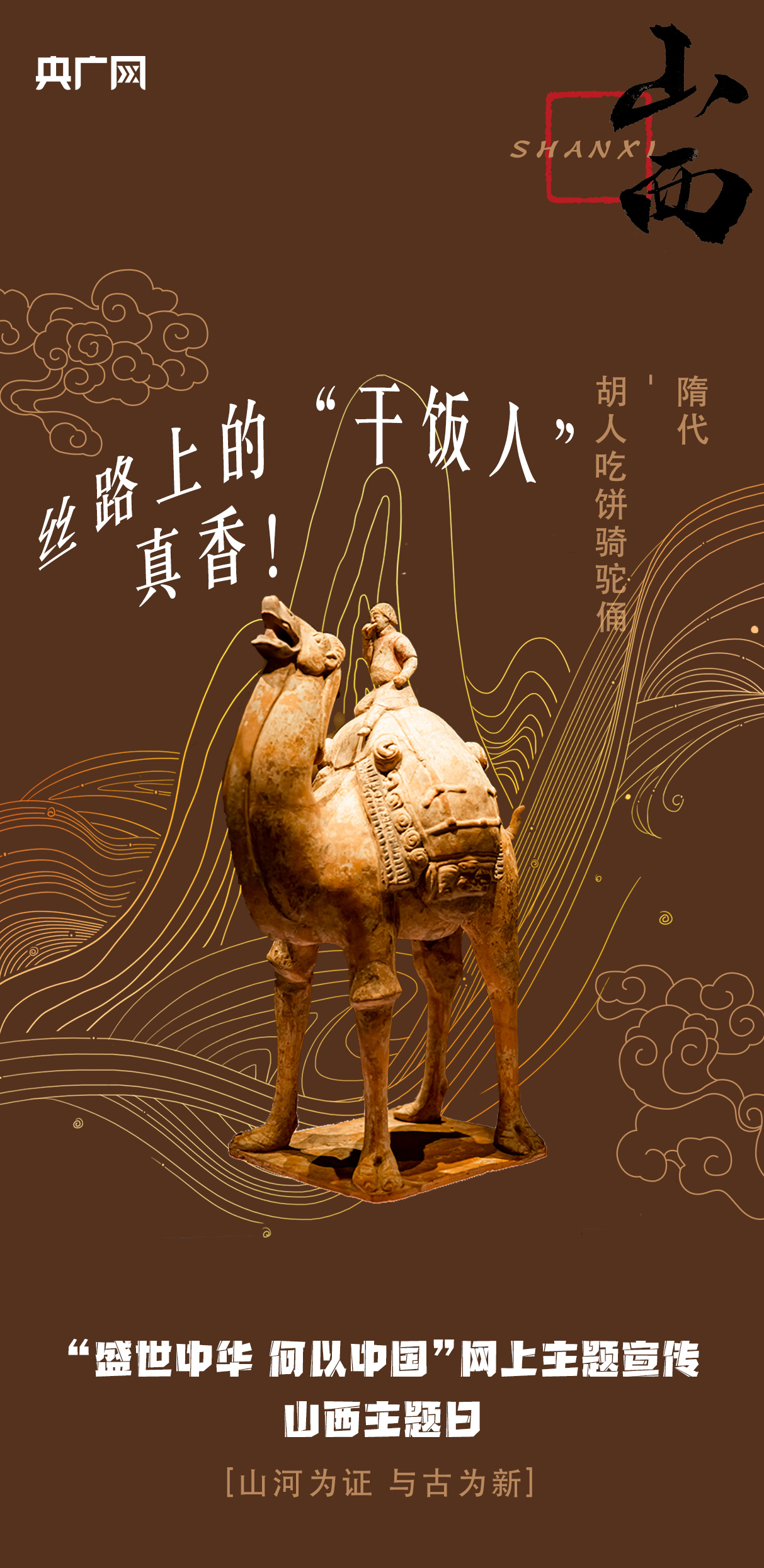 絲路漫漫,這位商人急著趕路,只能在路上匆忙“干飯”。他手里的餅子其實就是今天新疆的馕。胡人吃餅騎駝俑從一個側(cè)面反映出絲綢之路上貿(mào)易繁忙的景象。