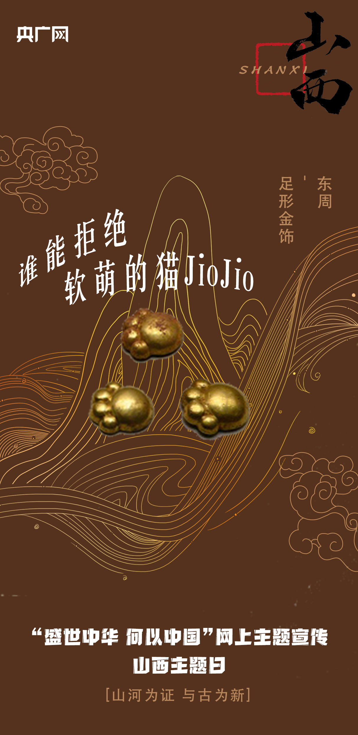 東周足形金飾。這組“貓爪”金飾文物出土于山西運城垣曲北白鵝墓地,距今已有2700多年的歷史,一共五件,或為佩戴在腰間的飾物。該金飾大小和小拇指指甲蓋相當(dāng),四個“腳趾”和一個“肉墊”的造型簡直就是貓爪復(fù)刻。