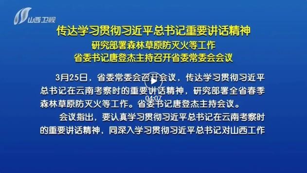 山西日報(bào)報(bào)道 3月25日,省委常委會(huì)召開會(huì)議,傳達(dá)學(xué)習(xí)貫徹習(xí)近平總書記在云南考察時(shí)的重要講話精神,研究部署全省春季森林草原防滅火等工作。省委書記唐登杰主持會(huì)議。