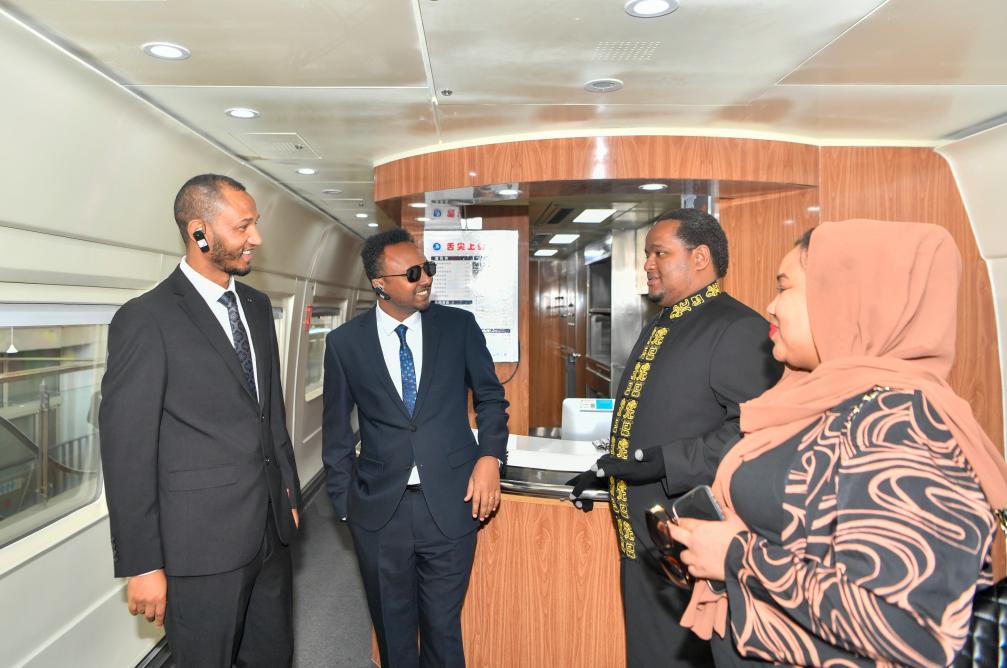 2023年11月7日,首屆亞吉鐵路高層管理人員培訓在天津鐵道職業(yè)技術學院舉行結業(yè)儀式。這是結業(yè)人員在高鐵模擬車廂內交談。