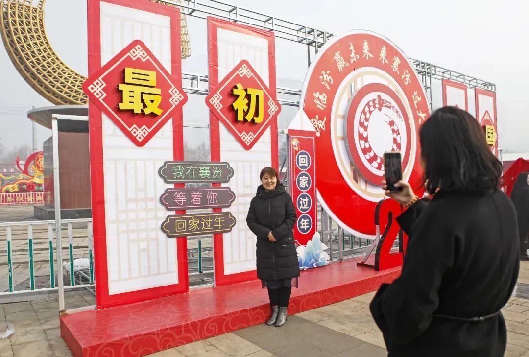 在臨汾,人們在襄汾丁陶文化廣場內陶寺龍盤展板前拍照,歡度新春佳節(jié);