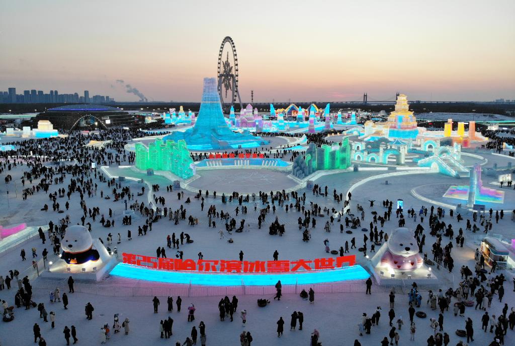2月15日,游客在哈爾濱冰雪大世界園區(qū)內游玩(無人機照片)。新華社記者 王建威 攝
