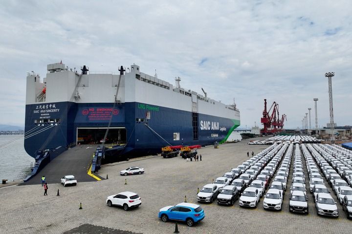 2024年1月23日,在福建廈門東渡港區(qū)現(xiàn)代碼頭,出口車輛陸續(xù)駛上“上汽安吉申誠”號(hào)汽車滾裝船(無人機(jī)照片)。新華社記者 姜克紅 攝