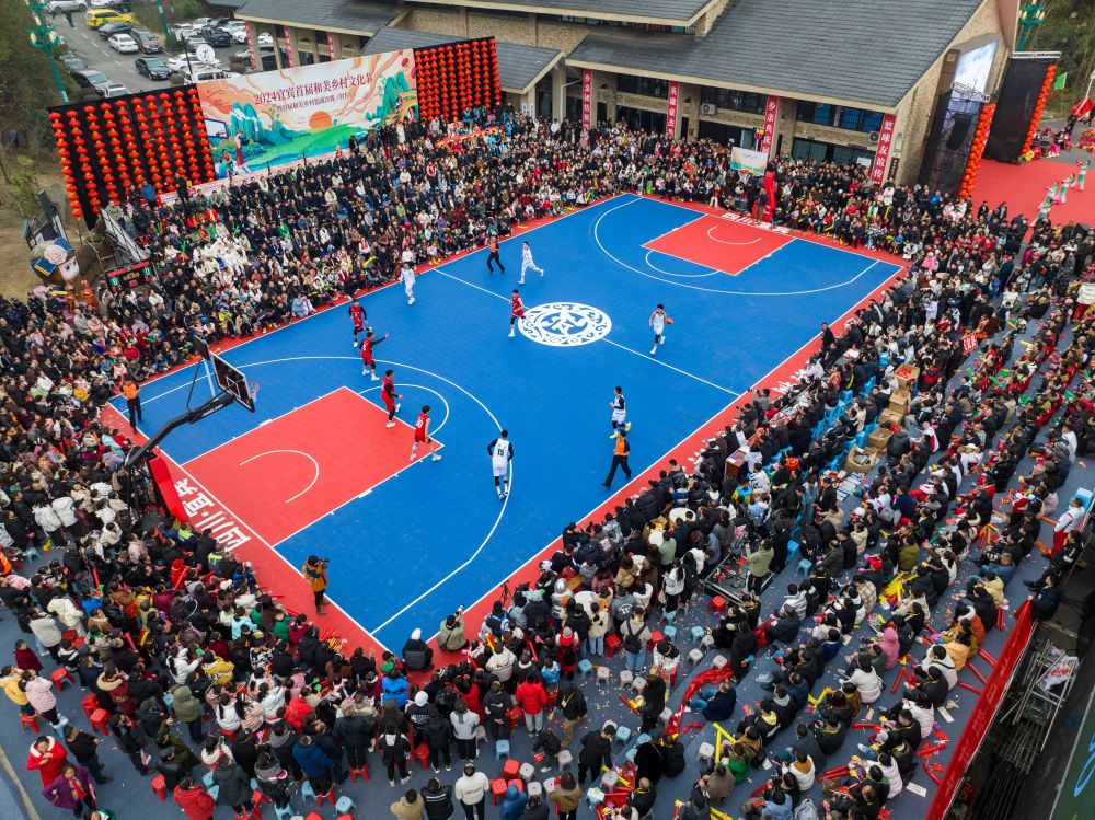 2024年1月29日,村民、游客在現(xiàn)場觀賽(無人機照片)。當日,在四川省宜賓市珙縣巡場鎮(zhèn)三合村,2024宜賓首屆和美鄉(xiāng)村文化節(jié)暨首屆和美鄉(xiāng)村籃球決賽(村BA)舉行,同時,現(xiàn)場還舉行了非遺年貨購物節(jié)、消費券發(fā)放等活動,以賽事經(jīng)濟激發(fā)鄉(xiāng)村活力。新華社發(fā)(莊歌爾攝)