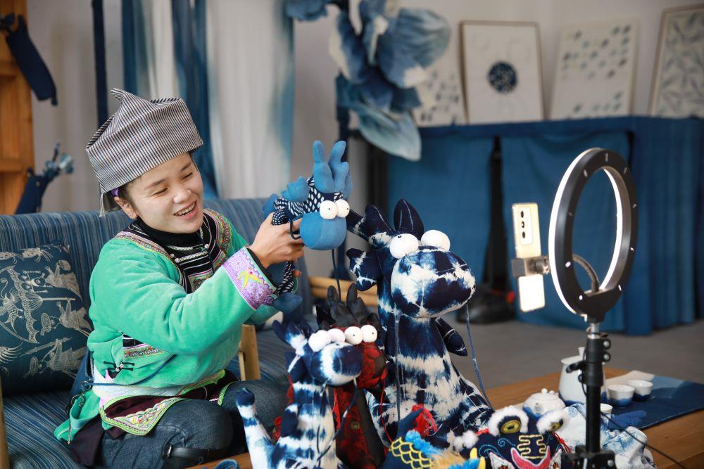 △2024年1月30日,貴州黔東南州榕江縣青于藍藍染藝術中心內(nèi),繡娘在直播帶貨。