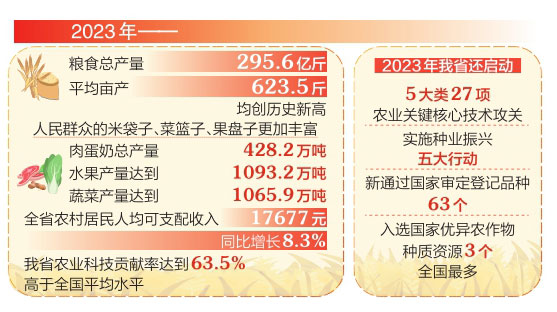 一分耕耘一分收獲。近年來,我省糧食和重要農(nóng)產(chǎn)品生產(chǎn)穩(wěn)定、供給充足,農(nóng)業(yè)農(nóng)村現(xiàn)代化不斷邁出新步伐。2023年,糧食總產(chǎn)量295.6億斤,平均畝產(chǎn)623.5斤,均創(chuàng)歷史新高;人民群眾的米袋子、菜籃子、果盤子更加豐富,肉蛋奶總產(chǎn)量428.2萬噸,水果、蔬菜產(chǎn)量分別達(dá)到1093.2萬噸、1065.9萬噸;全省農(nóng)村居民人均可支配收入17677元,同比增長8.3%。這些成績的取得,得益于科技賦能助力。2023年我省農(nóng)業(yè)科技貢獻(xiàn)率達(dá)到63.5%,高于全國平均水平。