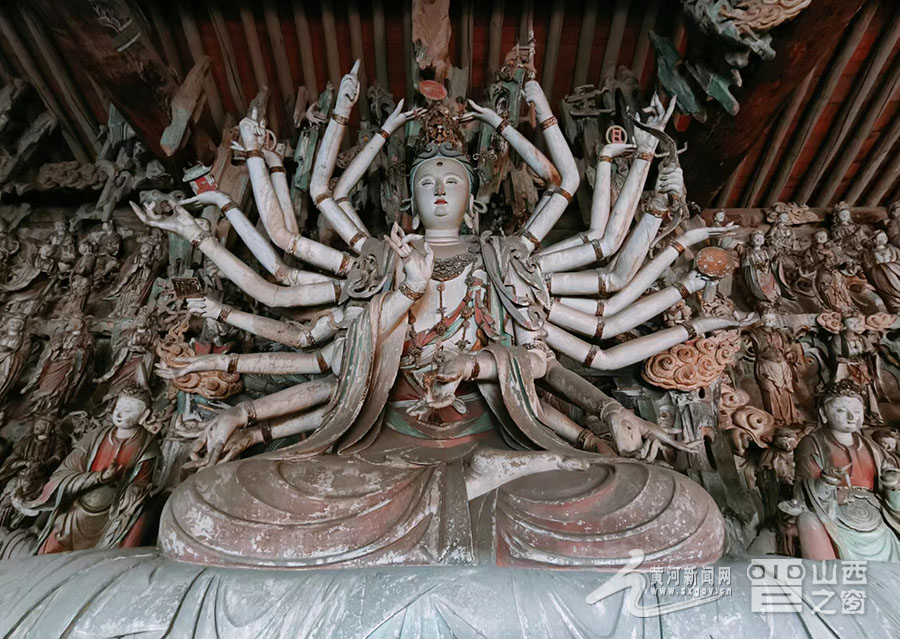 寺內(nèi)擁有總計2000多尊彩塑,大者丈余、小者尺許,每一壁龕為一獨立神話或佛教故事,人物造型生動,神態(tài)逼真,尤其以“千手觀音像”與“韋馱像”最為經(jīng)典。舞蹈《千手觀音》的靈感原型就是這尊千手觀音像。塑像高達數(shù)米,全身貼金,背后伸出上千只手臂,每只手掌上都有一只眼睛,錯落有致,整個造像氣勢恢宏,達到雕塑藝術(shù)中和諧、完美的境界。韋馱像巍然肅立,身披甲胄,神情凝重,整個身體呈現(xiàn)出一種微妙的動態(tài)平衡,是明代彩塑中少見的藝術(shù)杰作,被譽為“天下第一韋馱”“全國韋馱之冠”。景區(qū)講解員侯麗娟介紹:“這尊塑像的高明之處就在于匠師不落俗套,打破了一般程式的限制,賦予了韋馱一種時間的節(jié)奏性和動作的連續(xù)性,產(chǎn)生了雕塑作品的最高境界‘不動之動’?!?/p>
